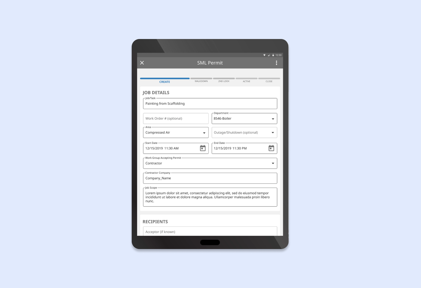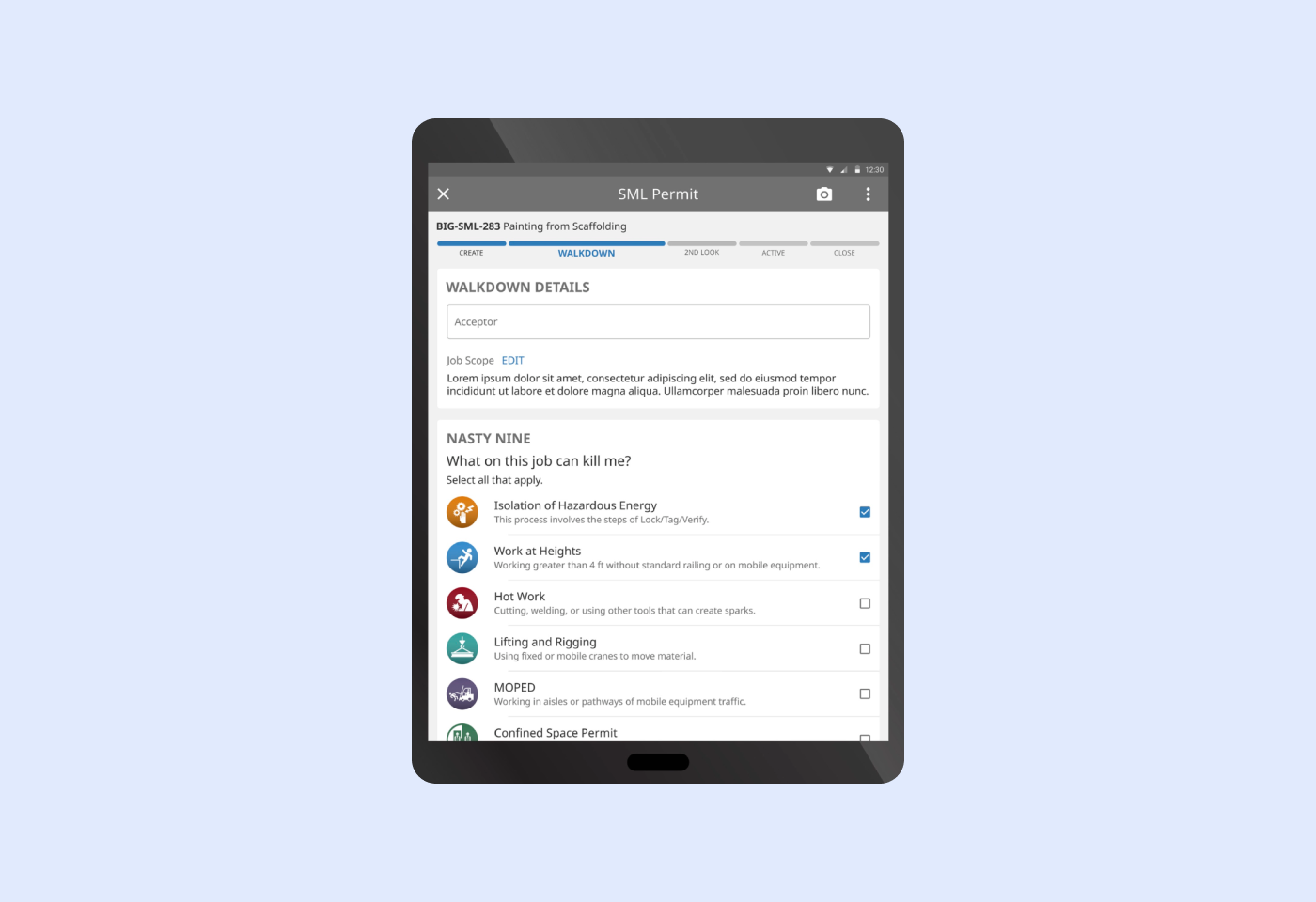 Our client needed a way to create and manage work permits and handle risk assessment in the field without worrying about keeping track of physical pieces of paper. Moving to a mobile app allows for ease of use in the field, as well as a easier way to view data from certain job sites to be able to track reoccurring issues or safety violations.