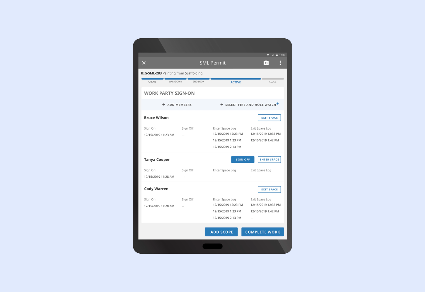 The Work Party Sign-On section allows you to check each person in and out of the work site for proper record keeping.